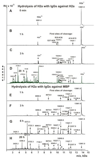MALDI mass spectra of the H2a (1.0 mg/mL) hydrolysis by IgGs (0.01 mg/mL) against H2a histone (A–D) and by Abs against MBP (0.02 mg/mL) (E–H) after different times of the mixtures incubation. Several peaks of short oligopeptides forming after 20 h of the incubation are shown in Panels (D,H).