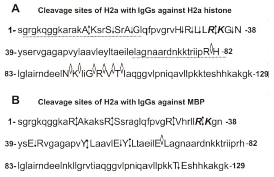 Sites of the H2b hydrolysis by IgGs against H2a histone (A) and by Abs against MBP (B) revealed using MALDI mass spectra (Figure 5). All major sites of the cleavage are shown by double arrows (↕), moderate ones by simple arrows (↓), and sites of minor hydrolysis by diamonds (◊) (A,B).