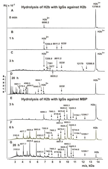 MALDI mass spectra of the H2b (1.0 mg/mL) hydrolysis by IgGs (0.01 mg/mL) against H2a histone (A–D) and by Abs against MBP (0.02 mg/mL) (E–G) after different times of the reaction mixture incubation. Several peaks of short oligopeptides forming after 20 h of the incubation are shown in Panels (D,G).