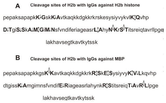 To some extent, a similar situation is observed for the hydrolysis of histone H2b by IgGs against this histone and against MBP (Figure 6 and Supplementary Figure S2). There are fragments of the sequences of H2b and MBP demonstrating increased homology. For example, MBP sequence APKRGSGKDGHHAAR is homologous to APKKGSKKAVTKAQK sequence of H2b: 43.8% identity and 68.8% similarity. This sequence of H2b was hydrolyzed by IgGs against H2b (APKK ↓GSKK↓AVTKAQK) and against MBP (APKKGSK↓KAVTKAQK), but at different specific sites (Figure 6 and Supplementary Figure S2). However, there are only a few good matches between the sites of H2b hydrolysis by antibodies against H2b and MBP (Figure 6, Supplementary Figure S2). Thus, abzymes against H2a and MBP, as well as H2b and MBP, demonstrate enzymatic cross-reactivity. However, cross-hydrolyzable sequences of H2a and H2b by IgGs against these histones and against MBP may overlap or be completely different (Figure 4 and Figure 6, and Supplementary Figures S1 and S2).