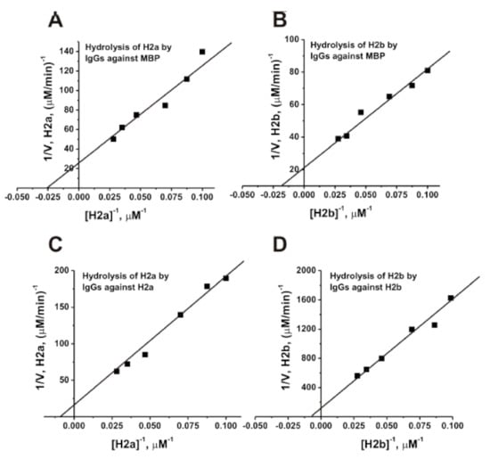 Determination of the Km and Vmax (kcat) values for H2a and H2b substrates in their hydrolysis by IgGs against MBP ((A,B), respectively; 0.04 mg/mL) and by abzymes against H2a ((C); 0.05 mg/mL) and H2b ((D); 0.042 mg/mL) using a Lineweaver–Burk plot. The average error in the initial rate determination at each substrate concentration from two independent experiments did not exceed 10–20%.