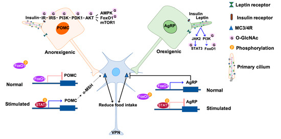 Involvement of O-GlcNAc in primary cilia signaling in the hypothalamic neurons. The activities of POMC and AgRP neurons are regulated by insulin and leptin hormones in response to nutrients. Under normal conditions, FoxO1 binds to the promoters agrp and pomc but have different effects. FoxO1 promotes the expression of AgRP to inhibit the activation of lateral neurons in the VPN through MC3/4R, while FoxO1 inhibits the expression of POMC. The binding of insulin or leptin to the receptors on the neuronal membrane phosphorylates and activates a downstream signal, such as JAK2-STAT3 and PI3K-PDK1-AKT-FoxO1. The phosphorylated FoxO1 is excluded from the nucleus, enabling the binding of phosphorylated STAT3 to the promoters. The binding of pSTAT3 to the agrp promoter inhibits AgRP expression thus releasing the inhibition to the lateral neurons. On the other hand, the binding of pSTAT3 to the pomc promoter promotes POMC expression and activate the lateral neurons to reduce hunger. The O-GlcNAcylated molecules are labeled with pink hexagons. The phosphorylated molecules are labeled with orange circles. IR, insulin receptors; IRS, insulin receptor substrate proteins; PI3K, phosphatidylinositol-3-kinase; PDK1, 3-phosphoinositide-dependent protein kinase 1; AKT, protein kinase B; AMPK, AMP-dependent kinase; FoxO1, forkhead box protein O1; mTOR1, mammalian target of rapamycin 1; JAK2, Janus kinase 2; STAT3, signal transducer and activator of transcription 3; MC3/4R, melanocortin 3 and 4 receptors; AgRP, agouti-related peptide; POMC, proopiomelanocortin.