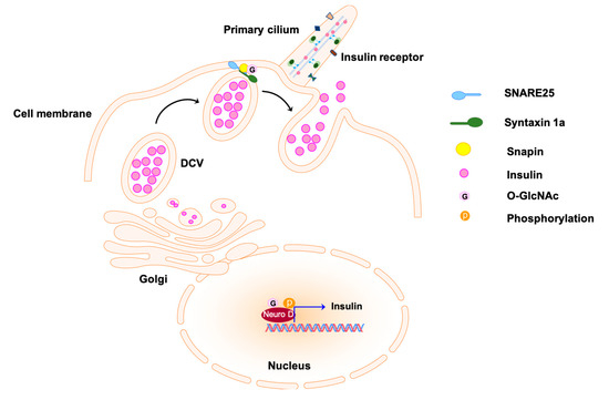 The elevation of OGN levels involved in the deterioration of insulin secretion was first observed in the pancreas of diabetic Goto-Kakizaki (GK) rats [140]. The GK pancreas showed higher OGT activity and OGN in both the islets and exocrine cells. Meanwhile, in vitro study showed that the elevated OGN levels blunted MIN6 β cells to glucose-stimulated insulin secretion, a phenomenon which is highly associated with decreased PDX1 levels in the diabetic islets [140]. Even though there is no direct evidence showing that primary cilia-mediated β-cells insulin secretion pathway through EphA2/3 are O-GlcNAcylated, their downstream insulin secretion activator ERK/MAPK is an up-regulator of O-GlcNAc [141]. Moreover, the regulation of O-GlcNAc in exocytosis vesicle-mediated insulin secretion is well studied. First, FoxO1, as a regulator of exocytosis, has its activity regulated by O-GlcNAc in response to glucose, and OGN of FoxO1 is increased in both diabetic hepatic and pancreatic β cells [142,143]. Snapin is another protein that forms a complex with SNAP25 to promote vesicle fusion and insulin secretion in pancreatic β cells. The phosphorylation of snapin on S50 is essential for pre-assembly with SNAP25, exocytosis vesicle fusion, and insulin secretion [144] (Figure 3). However, snapin pS50 is occupied by OGN in diabetic mice, which attenuates formation of the complex with SNAP25 and dampens insulin secretion [145]. Besides, both SNAP25 levels and the expression of Syntaxin 1 are decreased to reduce insulin secretion in pancreatic β-cells of GK rats. Overall, these observations show that O-GlcNAc is involved in regulating insulin expression and exocytosis-mediated insulin secretion. Though not many mechanisms have revealed how O-GlcNAc regulates insulin secretion, the participation of O-GlcNAc discussed here is directly or indirectly involved in the primary cilia-mediated pancreatic insulin secretion.