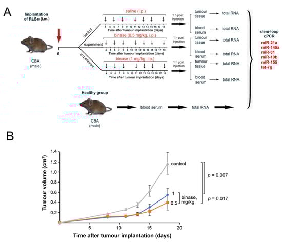 Effect of binase on the RLS40 tumour progression in CBA mice. (A) Design of the experiment. RLS40 cells (105 cells, 0.1 mL) were intramuscularly (i.m.) implanted into CBA mice. Starting on day 4 after the tumour implantation, the animals received saline buffer or binase intraperitoneally (i.p., doses and regiment are indicated on the scheme). One hour after the last injection, tumour and blood samples were collected, the total RNA was isolated and the miRNA levels were analysed using RT-qPCR. (B) Dynamics of tumour growth. Mice received saline buffer (control) or binase at the doses of 0.5 and 1 mg/kg. Statistical analysis was performed using one-way ANOVA with the Tukey’s post hoc test.