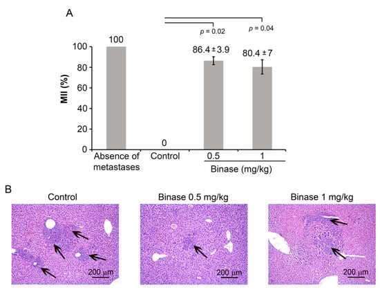 Binase administration led to the inhibition of metastasis development (Figure 3). Since most metastases in the liver were internal, we calculated the MII based on morphometric measurements of the metastasis area in relation to the total liver area. The MII in the control group was set to be 0%, and the MII corresponding to the absence of metastases was taken to be 100% (for details, see the Materials and Methods section). Binase at both doses efficiently suppressed the development of RLS40 liver metastases with an MII of 80–86% (Figure 3A).