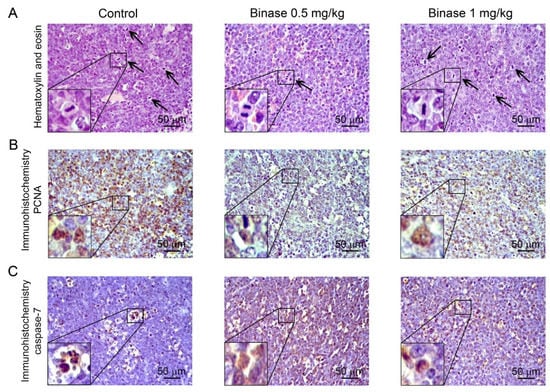 Together with a reduction in the tumour volume, binase also caused changes in the histological characteristics of the tumours. The tumours had rounded shape with clear boundaries and foci of necrosis in the central part of tumour nodes in all studied groups. The tumour tissue was represented by large monomorphic atypical lymphoid cells with a high mitotic rate and proliferative activity (Figure 4A). Morphometric analysis followed by calculations of the morphological parameters of the tumour tissue showed that in the control group, the numerical density of mitosis was 5.6 ± 0.4 per test area and the volume density of PCNA-positive tumour cells was 62.7 ± 3.8% (Table 2). In the group that received binase at a dose of 0.5 mg/kg, a 5.1-fold decrease in the numerical density of mitosis and 2.9-fold decrease in the volume density of PCNA-positive cells was observed in comparison with the control (Figure 4A,B and Table 2), whereas binase applied at a dose of 1 mg/kg did not have such pronounced effects: the number of mitoses and PCNA-positive cells decreased only by 1.8- and 1.4-fold in comparison with the control group, respectively (Figure 4B and Table 1).