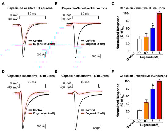 Effects of eugenol on voltage-gated sodium channel currents in small-sized TG neurons. Long-time base recordings of voltage-gated sodium channel (VGSC) currents measured during 80 ms-voltage steps from a holding potential of −60 mV to a potential of 0 mV delivered every 3 s. (A) Representative VGSC current recording following the application of 0.3 mM eugenol and (B) 2 mM eugenol. (C) Percentage inhibition of VGSC currents by eugenol in capsaicin-sensitive TG neurons (from 0.1 to 2 mM, n = 37). (D) Representative VGSC current recording following the application of 0.3 mM eugenol and (E) 2 mM eugenol. (F) Proportion of VGSC current inhibition effected by eugenol (from 0.1 to 2 mM, n = 29) in capsaicin-insensitive TG neurons. * p < 0.05 versus control (no treatment).