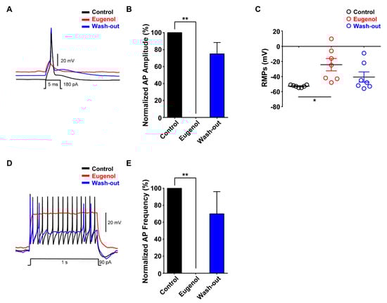We investigated the effects of eugenol on neuronal excitability in small-sized TG neurons. Under the condition of a whole-cell current-clamp, eugenol inhibited the generation of single AP following 180 pA of current injection for 5 ms; its effects were reversible after wash-out (Figure 2A,B). The resting membrane potential (RMP) measured in small-sized TG neurons was depolarized to −24 mV after eugenol treatment under the control condition (−53 mV). The effect of eugenol on RMP was relatively reversible after wash-out (Figure 2C). Additionally, we confirmed that eugenol completely suppressed the AP frequency after 90 pA for 1 s. These effects were also recovered by approximately 70% of the control level upon wash-out (Figure 2D,E).