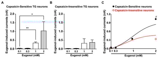 Eugenol induced inward currents in TG neurons. (A) Eugenol induced inward currents in capsaicin-sensitive small-sized TG neurons (15–25 μm diameter) in a dose-dependent manner (from 0.1 to 2 mM). (B) Eugenol induced inward currents in capsaicin-insensitive TG neurons (from 0.1 to 2 mM). (C) Summary of the effect of eugenol on capsaicin-sensitive and -insensitive small-sized TG neurons (n = 39 and n = 22, respectively). * p < 0.05 versus control, ** p < 0.01 versus control and # p < 0.05, capsaicin-sensitive versus capsaicin-insensitive.