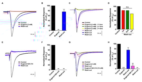 Eugenol has been primarily used as a local analgesic drug in dentistry practice and produces an anesthetic effect through VGSC inhibition in the dental primary afferent neurons of rats [12,13]. Eugenol also modulates various ion channels that are responsible for nociception and neuronal activity, leading to its analgesic effects [13,14,15,16,17]. However, local analgesic actions, caused by eugenol, are generally relatively short-lived and induce a non-selective blockade, which is inadequate for the treatment of prolonged acute and chronic pain [10,18]. In such instances, achieving prolonged sensory nerve and selective pain blockade is desired. In addition to the analgesic effects of eugenol alone, the possibility of prolonged sensory nerve and selective pain blockade is achieved through eugenol-induced TRPV1 activity and QX-314 [10,12,13,17,18,19]. This study aimed to compare the reversibility of eugenol alone with that of the combination of eugenol and QX-314 on neuronal excitability in TG neurons.