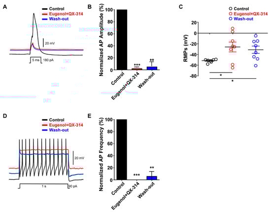 Effect of the co-administration of QX-314 and eugenol on APs in small-sized TG neurons. (A) Combination of eugenol (2 mM) and QX-314 (10 mM) completely abolished the AP generation even with current injection (180 pA, 5 ms). (B) Average percentage amplitudes of single APs after co-administration of eugenol and QX-314. (C) Average resting membrane potentials in the control, −53 mV; after co-administration of eugenol and QX-314, −26 mV; and after wash-out, −31 mV. (D) Eugenol and QX-314 reduced the AP frequency, which remained blocked even after wash-out. (E) All data were normalized to control (black bar). Data are presented as mean ± standard error of the mean (n = 8). Statistically significant differences from co-administration of eugenol and QX-314 or after wash-out in B and C. * p < 0.05 versus control, ** p < 0.01 versus control, *** p < 0.001 versus control.