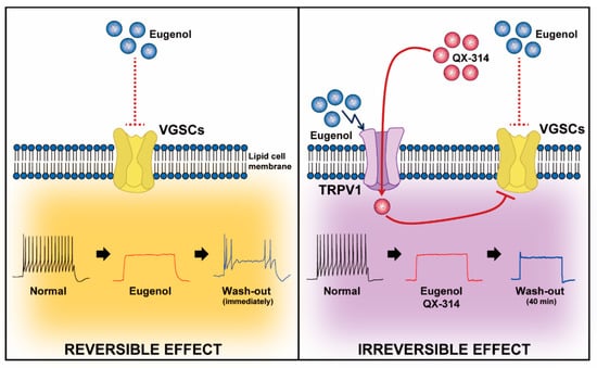 TG neurons express a variety of ion channels and receptors involved in the pain detection, propagation and transmission [TRP channels, purinergic P2X receptors, acid sensing ion channels (ASICs), PIEZOs, VGSCs, and voltage gated calcium channels (VGCCs), etc] [22,23,24,25,26]. TRP channels, including TRPV1, transient receptor potential ankyrin 1 (TRPA1), and transient receptor potential melastatin 8 (TRPM8), are expressed in nociceptive neurons, where they act as specific receptors for multiple and distinct nociceptive stimuli [27,28,29]. VGSCs regulate the generation and propagation of AP in sensory neurons such as TG [30,31,32]. Small-sized TG neurons are composed of unmyelinated C-fibers that express VGSCs (e.g., Nav1.7 and Nav1.8); the main ion channels responsible for pain sensation in the trigeminal system [13,21,30,32]. Therefore, controlling the excitability of nociceptive TG neurons by modulating VGSCs is potentially useful for the management of physiological or pathological pain in the orofacial area. For this reason, eugenol and QX-314 are studied as LA and VGSC blockers, respectively, to effect pain control.