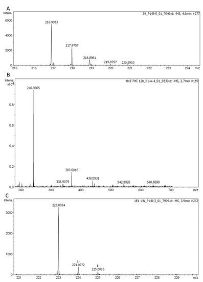 Exemplary results of standard SULT substrates metabolized in whole-cell biotransformations with human SULTs recombinantly expressed in fission yeast. (A) 4-nitrophenyl sulfate produced from 4-nitrophenol by SULT1A3 (C6H5NO6S, [M–H]− theor. = 217.9765, [M–H]– exp. = 217.9757, Δm/z = 3.67 ppm). (B) 7-hydroxycoumarin sulfate produced from 7-hydroxycoumarin by SULT1B1 (C9H6SO6, [M–H]− theor. = 240.9813, [M–H]– exp.= 240.9805, Δm/z = 3.32 ppm). (C) 1-naphthyl sulfate produced from 1-naphthol by SULT1E1 (C10H8O4S, [M–H]– theor. = 223.0071, [M–H]– exp. = 223.0054, Δm/z = 7.62 ppm).