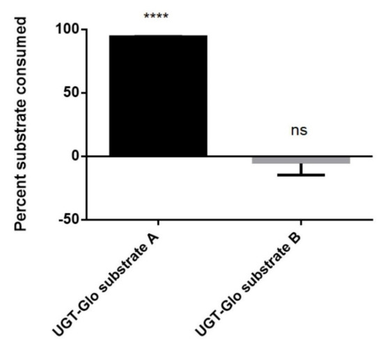 Proluciferin probe substrates for the convenient activity monitoring of CYPs or UGTs have been commercially available for many years. However, a similar test system for the determination of SULT activities was lacking. Since a considerable number of compounds are substrates for both UGTs and SULTs, we speculated that at least one of the two available UGT proluciferin substrates might also be a SULT substrate. In order to test this hypothesis, we performed sulfation reactions using the S9 fraction of human liver cells, the cofactor PAPS, and GSA or GSB. These experiments showed that GSA, but not GSB, is metabolized by the S9 fraction in a PAPS-dependent manner (Figure 3). Formation of sulfated GSA was also confirmed by LC–MS analysis (C9H6N2O4S2, [M–H]– theor. = 268.96962, [M–H]– exp. = 268.96900, Δm/z = 2.31 ppm). The reaction scheme for these experiments is shown in the graphical abstract of this manuscript. In conclusion, these data demonstrate that GSA is a substrate for SULTs contained in the S9 fraction of human liver cells.