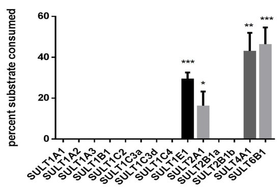 Activity of human SULT enzymes towards GSA. Enzyme bags were prepared from 14 fission yeast strains as indicated and activity was monitored by detecting luminescence. Data shown as percentage of substrate consumed after 3 h of reaction. Data shown were calculated from three independent experiments done in triplicate. * p < 0.05; ** p < 0.01; *** p < 0.001 vs. control (i.e., reaction samples without addition of PAPS).