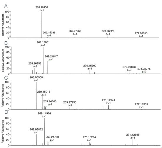 Mass spectra of 6-hydroxy-4-methyl-1,3-benzothiazole-2-carbonitrile sulfate (sulfated GSA) obtained by enzyme bag-catalyzed biotransformations with four human SULTs recombinantly expressed in fission yeast. (A) SULT1E1 (C9H6N2O4S2, [M–H]− theor. = 268.96962, [M–H]− exp. = 268.96936, Δm/z = 0.97 ppm). (B) SULT2A1 ([M–H]− exp. = 268.96953, Δm/z = 0.33 ppm). (C) SULT4A1 ([M–H]− exp. = 268.96908, Δm/z = 2.01 ppm). (D) SULT6B1 ([M–H]− exp. = 268.96852, Δm/z = 4.09 ppm).