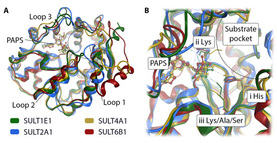 Superposition of four SULT isoforms with cofactor PAPS. SULT1E1 and SULT2A1 are X-ray structures taken from the PDB. SULT4A1 and SULT6B1 are homology models. (A) The view of the full structures shows deviations in three loops contributing to the binding site. (B) A closer look at the catalytic site shows the position of the conserved catalytically relevant histidine (i His). A lysine (ii Lys) is located in the vicinity of the substrate pocket (indicated by a dotted semicircle), while the second lysine is only present in SULT1E1 and SULT4A1 (iii Lys).