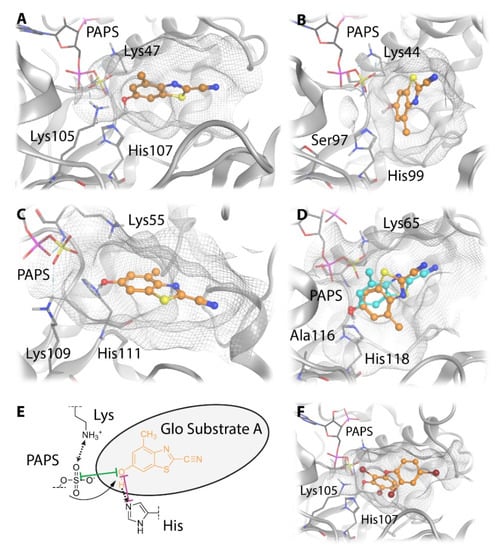 However, the catalytic histidine and cofactor-binding lysine are highly conserved in all four SULT isoforms, and differences in the third key residue position do not rationalize the observed activity trend of UGT-Glo substrate A. Hence, we docked this substrate to the active sites of the four SULT isoforms to suggest differences in the binding modes. The most plausible orientations of the substrate from docking (Figure 8A–D) resemble the reference binding mode of the co-crystallized ligand in the SULT1E1 X-ray structure (Figure 8F, PDB-id: 4JVN). The slot-like substrate pockets orient the substrate in a horizontal position in SULT1E1 (Figure 8A) and more vertically in SULT2A1 (Figure 8B). The substrate pockets of SULT4A1 (Figure 8C) and SULT6B1 (Figure 8D) are more voluminous and open. In SULT6B1, GSA can even adapt two distinct catalytically competent orientations.