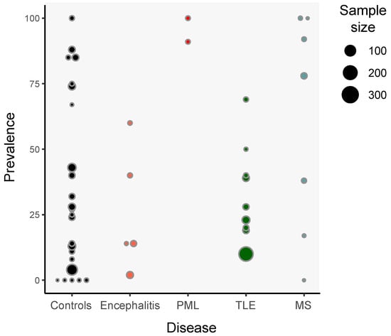 Dotplot indicating the prevalence of detection of HHV-6 DNA in studies with a sample size greater of at least 5 individuals in different neurological conditions and controls with no neurological conditions. The size of each dot is proportional to the sample size of each study. When multiple regions were assessed per individual, we chose the one with the highest HHV-6 prevalence.