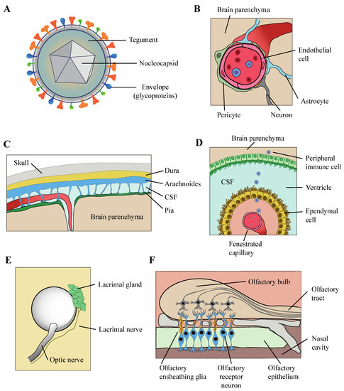 Schematic representation of HHV-6 virion structure (A) and suggested HHV-6 entry routes to the brain parenchyma: (B) The blood–brain barrier; (C) the meningeal barrier; (D) the blood–CSF barrier at the choroid plexus; (E) optic infection through lacrimal or optic nerves, and (F) the olfactory pathway. CSF: Cerebrospinal fluid.