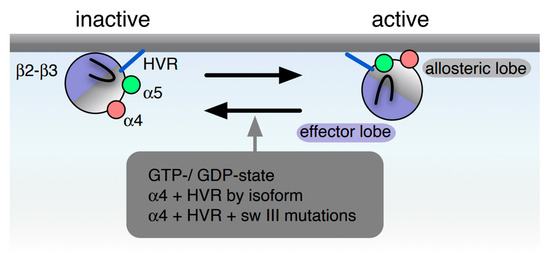 Isoform- and activation-state dependent Ras reorientation on the plasma membrane. Computational and experimental data have provided support for distinct orientation states of Ras on the membrane. Earlier work showed that in the inactive (GDP-bound) state H-Ras contacts the membrane mostly via the lipid modified HVR (blue). However, in the active (GTP-bound) state the dominant conformations have helix α4 (pink) contacting the membrane. Follow up work further suggested that properties of helix α4 and the HVR can shift the reorientation balance. As described previously, switch III (sw III) comprises the β2-β3 loop (black loop) together with helix α5 (green) [21].