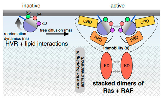 Ras dynamics on the membrane. Inactive Ras diffuses more freely than active Ras. Lateral segregation and stochastic clustering of Ras isoforms appears to be predominantly mediated by HVR interactions with membrane lipids. In living cells, diffusion can be somewhat hindered by the subcortical actin meshwork (cross hatched). Current data suggest that transient immobilization of active Ras occurs after engagement of binding partners, such as RAF effectors (domains in yellow to orange). Both increased molecular mass and enhanced trapping in the actin meshwork contribute to hindered diffusion. The minimal core of these immobile nanoclusters appears to be the dimers of Ras bound to dimers of RAF, with RAF proteins actually ‘scaffolding’ the Ras nanoclusters by enhancing trapping events. RBD—Ras binding domain, CRD—cysteine rich domain, KD—kinase domain.