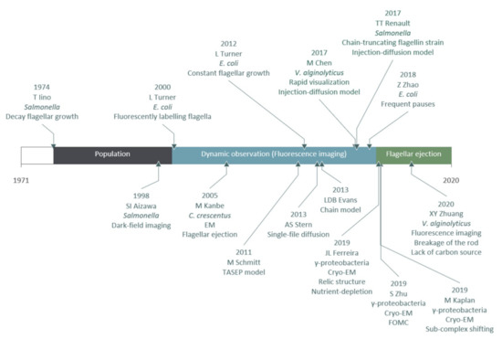Figure 3. A timeline of experiments and models on flagellar filament construction and loss.