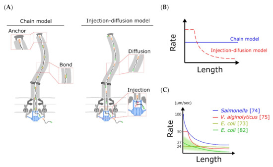In 2017, Chen et al. built an injection-diffusion model to explain the high-resolution experimental data from V. alginolyticus flagella growth [75] with an initial constant growth rate and then a decayed growth rate (Figure 4A,C). The main difference of this model from the previous diffusion mechanism model is the addition of the pumping force at the secretion side that can push flagellin into the channel (Figure 4A). With Brownian dynamic simulation, they successfully reproduced the length-dependent growth rate and determined that the effective diffusion constant of flagellin in the channel is 1000 times smaller than that in the bulk water. With a reduction in the injection force, the initial constant growth rate region can be eliminated. Simultaneously, Renault et al. demonstrated the length-dependent Salmonella flagellar growth rate based on the injection-diffusion mechanism with analytical approaches [74].
