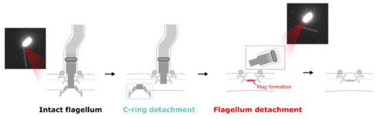 Although the structure and mechanical functions of bacterial flagella are well researched, the dynamics of flagellar loss remains poorly understood. Recent works have revealed that flagella are impermanent cellular structures, and cells can actively abandon this large motility apparatus [26,27,28,29,30]. Whereas molecular triggering and the activation mechanism remain unknown, the novel finding of the active ejection of the flagellar filament provides a new direction of cellular adaptation to external stimuli.
