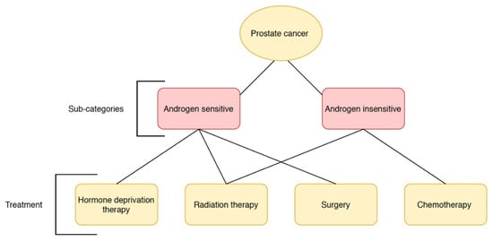 The main treatments that are available for prostate cancer include radiation therapy, surgery, chemotherapy, and hormonal therapy (Figure 1). The treatment delivered to each patient depends on the nature of the tumor and the probability of success and reoccurrence while trying to reduce adverse events. Surgery is most often performed in high-risk cases with advanced in situ carcinoma [13], and, although the reduction in metastatic progression, as well as localized tumor progression, is remarkably reduced, it is associated with a relatively low reduction in mortality risk after 10 years [14].