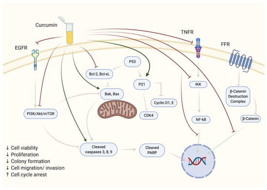 A study by Zhu et al. investigated the effects of curcumin on the PC3 and DU-145 cell lines [68]. Cell viability, DNA synthesis, and cyclin D1, PCNA, β-catenin, and c-myc protein levels were reduced, while the levels of p21 were increased by curcumin treatment. Furthermore, curcumin increased the levels of miR-34a, a potent tumor suppressor, and the use of a miR-34a inhibitor abolished curcumin’s effects on cell viability [68].