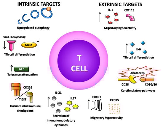 According to experimental studies, a recent report for ALPN-101, a fusion protein simultaneously inhibiting CD28 and ICOS costimulatory pathways, showed better suppression in comparison to abatacept, by reducing release of pro-inflammatory cytokine such as TNF-α, IFN-γ and IL-6 in peripheral blood mononuclear cells from SS patients []. On the other hand, representative experimental strategies used in animal models have delivered promising data targeting T cell immunobiology. For instance, inhibition of impaired autophagy reduces pathological features of the disease []. Administration of a neutralizing anti-TNF-α antibody during the stage prior to SS onset in NOD mice significantly improved salivary secretion, decreased the number of leukocyte foci, and reduced T and B cells numbers as well as T-bet protein level in submandibular glands, suggesting a decrease in Th1 and CTL cells infiltration []. Blocking IL-21 pathway in a condition where the negative regulator mechanism fails, has been shown ameliorating SS-like diseases manifestations [,]. As described above, T cells hyperactive migration is essential for pathological establishment in gland to coordinate the onset and progression of SS. Blocking IL-7 receptor signaling has arisen as a promising mechanism for SS treatment because it disrupts salivary gland inflammation, rescues the secretory function, and reduces leukocyte infiltration and antibody production [,]. Likewise, CXCR3 blocking interrupts the development of key pathogenic signals, reducing the percentages of infiltrating CXCR3+CD8+ T cell and the secretion of proinflammatory cytokines []. Thus, several factors are arising as potential biomolecular targets (Table 1; Figure 2) for preclinical and clinical research, which are critical to regulate T cell immunobiology in SS pathology.
