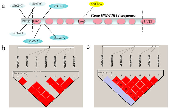 The linkage disequilibrium (LD) analysis of 7 SNPs in the porcine HSD17B14 gene. (a) The position of seven SNPs in the porcine HSD17B14 gene. (b) LD analysis of the seven potential SNPs in Large White gilts. (c) LD analysis of the seven potential SNPs in Mi gilts.