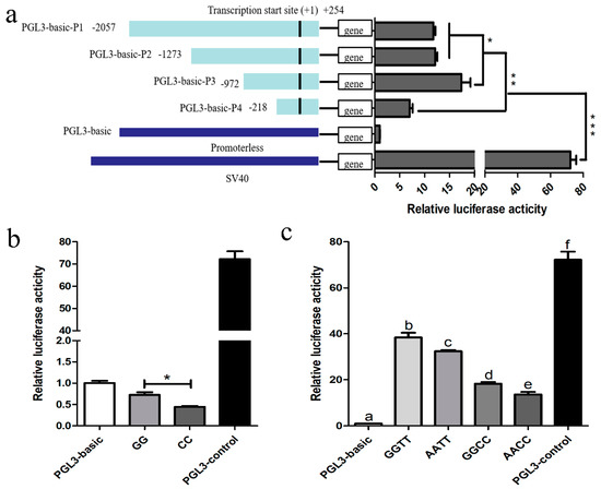 In the seven SNPs of the HSD17B14 gene, rs342163057 (−850G > C) and rs329427898 (−683A > G) are located at downstream of the promoter region and rs319864566 (−502T > C) is located at the core promoter region. Promoter activity of different genotypes of rs342163057 (−850G > C), rs329427898 (−683A > G), and rs319864566 (−502T > C) in the porcine HSD17B14 gene were analyzed using a dual-luciferase reporter assay system. As shown in Figure 3b, the luciferase activity was greater in plasmids of genotype GG than that of plasmids of genotype CC of rs342163057 (p < 0.05). In Figure 3c, the luciferase activities of plasmids with combined genotype GGTT, AATT, GGCC, or AACC of rs329427898 (−683A > G) and rs319864566 (−502T > C) were greater than those of the negative control pGL3-basic group (p < 0.01) but less than those of the pGL3-control group (p < 0.01). Luciferase reporter plasmids with combined genotype AATT had less (p = 0.0451) luciferase activity than that of plasmids with combined genotype GGTT. In addition, the plasmids with combined genotype AACC had lower (p = 0.026) luciferase activities than those of plasmids with combined genotype GGCC. These results suggest that the plasmids with genotype AA had lower luciferase activities than those of plasmids with genotype GG of rs329427898 (−683A > G). At the same time, the plasmids with combined genotype GGCC have lower (p = 0.0007) luciferase activities than those of plasmids with GGTT, while the plasmids with combined genotype AACC had lower (p = 0.0001) luciferase activity than that of plasmids with combined genotype AATT of rs329427898 (−683A > G) and rs319864566 (−502T > C). These results suggest that the plasmids with genotype CC had lower luciferase activities than those of plasmids with genotype TT of rs319864566 (−502T > C).
