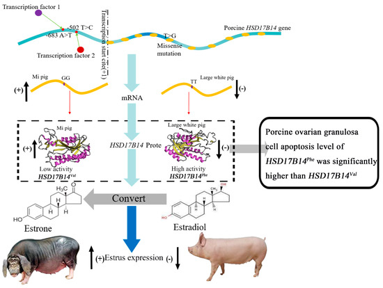 Our previous study found that the expression level of the HSD17B14 gene in the follicles was greater in Mi gilts than in Large White gilts during diestrous, but was lower in Mi gilts than in Large White gilts during estrus [24]. The porcine HSD17B14 protein was mainly involved in the transformation from high-efficient E2 to low-efficient E1 in the estrogen metabolism pathway [14]. Previous studies demonstrated that the concentrations of estradiol were positively associated with estrus signs of gilts [2,9]. Therefore, the rs329427898 and rs319864566 genotypes in the HSD17B14 gene could affect the binding of RNA polymerase and transcription factors to the promoter region, influencing its expression and the ability to degrade estradiol to estrone. In addition, although Mi gilts showed an increase in protein and mRNA expression levels, the missense mutation of Phe73Val in the fifth exon weakens the ability of the protein to degrade estradiol to estrone, which would make the estrus signs more obvious and longer lasting in Mi gilts (Figure 6). Furthermore, this missense mutation in Mi gilts decreases the apoptosis level of ovarian GCs compared to Large White gilts, which has a profound impact on the estrus sign traits of the two pig breeds. These might be the cause of the difference of estrus signs between the Chinese Mi and European Large White gilts. Importantly, the results in the present study provide a molecular marker (HSD17B14Val) that can be used to screen gilts with better estrus sign traits. Better estrus traits could also improve the accuracy of estrus detection, which increases the efficiency of pig reproduction.