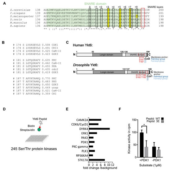 Figure 1. Several phosphorylation sites in the Ykt6 sensitive factor attachment protein receptors (SNARE) domain are evolutionarily conserved. (A) Sequence alignment of Ykt6 SNARE domain (Human: position 136–198) of different eukaryotes. Conserved serines and threonines at SNARE layers are marked in yellow, lipid-modified cysteines are in the red box. (B) PhosphoSite prediction for human Ykt6 position S174, S181, and T187 using Netphos 3.1 []. (C) Scheme of human and Drosophila Ykt6 with predicted phosphorylation sites that were either mutated to alanine or glutamic acid. (D) In vitro kinase assay of biotinylated peptide of the Ykt6-WT SNARE domain with 245 different serine/threonine kinases. (E) Ten out of 18 identified kinases phosphorylating Ykt6 SNARE domain >twofold over background were validated. (F) A validation kinase assay comparing Ykt6-WT versus Ykt6-3E found phosphoinositide-dependent kinase-1 (PDK1) as a kinase phosphorylating the SNARE domain. * = 0.05.