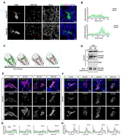 Ykt6 was shown previously to be involved in Wnt secretion from Drosophila cells of the developing wing epithelium as well as from human cells [,]. To understand the dynamics of Ykt6-membrane attachment, we used Wnt3A secretion as a Ykt6-dependent process to study the role of the putative phosphorylation sites. We used “retention using selective hook” (RUSH), which is an inducible system for the release of secretory cargo []. This system consists of an ER-resident streptavidin-KDEL fusion protein (“hook”) and a “bait”-protein fused to a streptavidin-binding peptide (SBP) to be retained in the ER in the absence of biotin (Figure 2C). We constructed a tagged Wnt3A with an integrated GFP and an SBP between the signal peptide and the core sequence of Wnt3A. In Hek293T cells, this construct was secreted into the supernatant in the presence of biotin (Figure 2D) and localizes to the ER in the absence of biotin (Figure 2E). An addition of 50 µM biotin triggered the ER-release of Wnt3A by competitive binding to the streptavidin hook, and 30 to 60 min later, Wnt3A localized to the perinuclear region, indicating transport to the Golgi (Figure 2E,F). In cells co-expressing Ykt6-WT, Wnt3A is detected both at the Golgi and in the cytoplasm at later time points (>120 min), partially co-localizing with Ykt6 (Figure 2E,G). In contrast to Ykt6-WT, the co-expression of Ykt6-3E leads to strong accumulation with Wnt3A at the plasma membrane (>120 min) (Figure 2F,H). Hence, in the presence of endogenous Ykt6, the phosphomimicking Ykt6 mutant neither has a dominant negative effect, nor blocks ER to Golgi trafficking of Wnt3A but accumulates at different post-Golgi membranes within the secretory pathway together with Wnt3A.