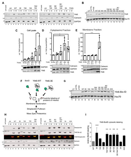 Figure 3. SNARE phosphorylation sites determine membrane attachment and auto-inhibited conformation. (A) Representative immunoblot of cell fractionation of different Ykt6 mutant constructs transfected in Hek293T cells and stained with Ykt6 and fraction markers GADPH for cytoplasmic (C) and Calnexin for membrane (M) fraction (n = 4). (B) Representative immunoblot of Ykt6 knockdown and overexpression of different Ykt6 mutant constructs with Hsc70 as a loading control. (C) Representative immunoblot and quantification of overexpressed Ykt6-WT construct in three different concentrations (0.1 µg, 0.3 µg, and 1 µg), along with overexpressed Ykt6-3E construct and endogenous Ykt6 from three biological replicates. (D) Representative blot and quantification of endogenous and overexpressed Ykt6-WT (0.1 µg, 0.3 µg, and 1 µg), 3E (1 µg) in the cytoplasmic fraction, n = 4 (E) Representative blot and quantification of endogenous and overexpressed Ykt6-WT (0.1 µg, 0.3 µg, and 1 µg) or 3E (1 µg) in the membrane fraction, n = 4. (F) Scheme of biotin-labeling assay. Biotin–ligase BioID was expressed alone or as Ykt6-WT or -3E fusion constructs in Hek293T cells in the presence of 50 µM biotin. After membrane fractionation, proteins were streptavidin-purified and subjected to mass spectrometry or immunoblotting. (G) Representative immunoblot of Ykt6 knockdown and overexpression of different Bio-ID-tagged Ykt6 mutant constructs with Hsc70 as a loading control (H) Representative immunoblot of cell fractionation of different Ykt6-BioID constructs transfected in Hek293 cells, stained with Streptavidin, Ykt6 and fraction markers as in (B) (n = 3). (I) Quantification of biotin labeling in the cytosolic fraction of (H). * = 0.05, ** = 0.01, *** = 0.001, **** = 0.0001.