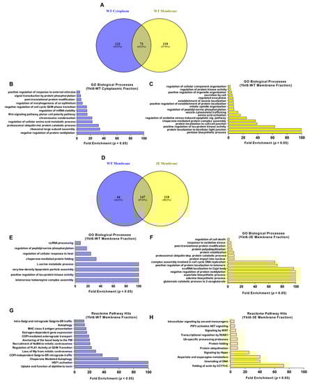 Figure 4. Ykt6 SNARE-dependent proximity proteome. (A) Proteins enriched in Ykt6-WT cytoplasmic fraction versus membrane fraction. (B,C) Enriched GO biological processes of Ykt6-WT in cytoplasmic versus membrane fraction. (D) Proteins up-regulated between Ykt6-WT versus Ykt6-3E in the membrane fraction. (E,F) Enriched GO biological processes of Ykt6-WT and -3E with a (p-value < 0.05) as determined by Fisher Exact Test with the Benjamini–Hochberg False Discovery Rate < 0.05. (G,H) Enriched Reactome Pathway hits of Ykt6-WT and -3E in the membrane fraction based on FDR < 0.05.