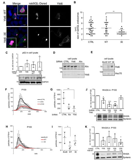 Figure 5. Ykt6 regulates extracellular vesicle (EV) secretion in a concentration-dependent manner. (A) Hek293T cells were co-transfected with plasmids for Rab5Q79L-DsRed and either control, Ykt6-WT, or Ykt6-3E and analyzed by immunofluorescence microscopy. Scale bar represents 10 µm. (B) Quantification of (A), number of endosomes: control (n = 34), Ykt6-WT (n = 21), or Ykt6-3E (n = 18) from two independent biological replicates. (C) Representative blot and quantifications of p62 levels in HCT116 cells transfected with siRNA against control or Ykt6 and Ykt6-WT or 3E. (D) Immunoblot of Hek293T cells transfected with siRNA against control, Ykt6, or Alix. (E) Immunoblot of Hek293T cells transfected with Ykt6-WT, -3E, and BioID mock plasmid. (F) Extracellular vesicles (EV) were purified from the supernatant. EVs in P100 are centrifuged 1 h at 100,000× g. Size profile of P100-EV was analyzed by nanoparticle tracking analysis (NTA). (G) Quantification of 100–200 nm EV size profile in (D) from three biological replicates. Significance level ** = 0.01. (H) NTA EV size profile of P100 from (F,I) Quantification of 100–200 nm sized EVs from (G) from three biological replicates. * = 0.05. (J,K) Immunoblot and quantification of Wnt3A in P100 purified from Hek293T cells transfected with siRNA against control, Ykt6 or Alix and (J) Ykt6-WT or 3E, *** = 0.001 and (K) Ykt6-WT in three different concentrations (0.1, 0.3, and 1 µg DNA) * = 0.05.
