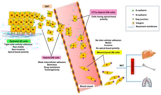 Epithelial mesenchymal transition (EMT), is a complicated cellular process in which epithelial (E) cells lose adherence through cellular junctions, get deprived of apico-basolateral polarity, gain migratory potential and are transformed to mesenchymal (M) phenotype. EMT has been frequently associated with embryonic development, wound healing and cancer progression. During embryonic development, embryonic cells undergo EMT in order to migrate to a distant site and subsequently follow the reverse process, M-to-E transition (MET), to differentiate into various cell types. Likewise, cancer cells reactivate the EMT program during delamination from a primary tumour, migrate to distant organs, and form secondary tumours [1]. EMT is accompanied with disruption of adherens junctions and tight junctions, resulting in the dissemination of E cells. EMT aggravates the expression of M marker proteins, promotes attachment to the extracellular matrix (ECM) and acquisition of spindle-shaped M phenotype, enhances the migratory potential of an individual cell by reorganizing actin fibres and invades through basement membranes, blood and lymphatic vessels. Subsequent to intravasation, the cells primed for EMT survive as circulating tumour cells (CTCs) and ultimately extravasate into distant organs [2]. The CTCs harbour both E and M traits and exhibit hybrid E/M phenotypes (Figure 1) which impart them with plasticity and a survival advantage in different microenvironments during metastasis [3]. After extravasation, tumour cells need to undergo MET for metastatic colonization and growth at secondary sites. EMT endows cancer cells with aggressive phenotypes, drug resistance, aids suppression of senescence, anoikis, immune surveillance and acquisition of cancer stem cell (CSC)-like characteristics [4]. Conventional EMT has been often defined by the cadherin (cad) switch which indicates depletion of the epithelial marker E-cadherin (E-cad) and the gain of the M marker neural (N)-cadherin (N-cad). Migration of fibroblast-like M cells is mediated by integrin regulated interaction between cells and ECM [5]. EMT is governed by a multitude of factors which include ECM components, hypoxia, exosomes, non-coding RNAs, and growth factors such as hepatocyte growth factor (HGF), fibroblast growth factor (FGF) and transforming growth factor-β (TGF-β) [4]. The mobility of the tumour cells is greatly influenced by the tumour microenvironment (TME) and the proximity to blood vessels [6]. EMT is frequently coupled with poorly differentiated tumours arising from different tissues.