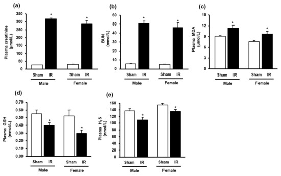 Plasma creatinine, blood urea nitrogen, malondialdehyde, glutathione and hydrogen sulfide levels in rats. The left kidney of male and female rats was subjected to 45 min ischemia followed by 24 h reperfusion (IR) or without ischemia (sham) as a control. The plasma (a) creatinine, (b) blood urea nitrogen (BUN), (c) malondialdehyde (MDA), (d) reduced glutathione (GSH) and (e) hydrogen sulfide (H2S) were measured. The results are expressed as mean ± SE (n = 5–6). * p < 0.05 when compared with the value obtained from the sham group.