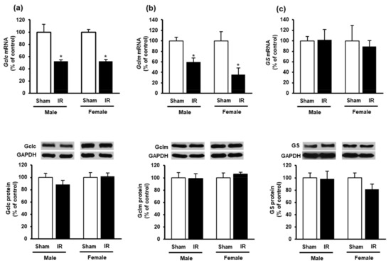 To investigate if kidney ischemia-reperfusion affected GSH production in the heart, we examined the expression of GSH-synthesizing enzymes. The mRNA expression of glutamate-cysteine ligase (Gclc and Gclm) subunits were significantly reduced in the heart of both male and female rats after kidney ischemia-reperfusion as compared to the sham-operated group (Figure 3a,b). However, there was no significant change in Gclc and Gclm protein levels in the heart (Figure 3a,b). Furthermore, there was no significant change in glutathione synthetase mRNA or protein in the heart (Figure 3c).