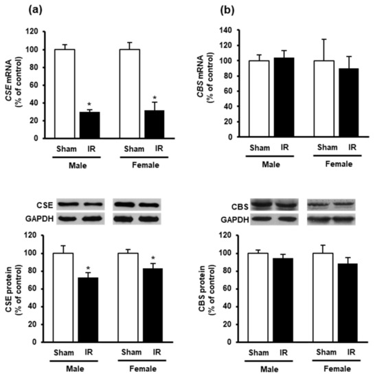 To investigate if kidney ischemia-reperfusion could affect H2S production in the heart, we examined the expression of H2S-synthesizing enzymes CBS and CSE. Kidney ischemia-reperfusion caused a significant reduction of CSE mRNA and protein levels in the heart of both male and female rats (Figure 4a), while did not alter CBS expression (Figure 4b).