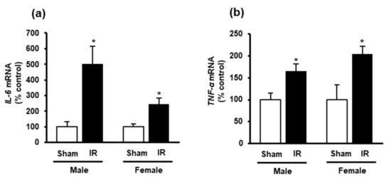 Effect of kidney ischemia-reperfusion on IL-6 and TNF-α expression in the heart. The left kidney of male and female rats was subjected to 45 min ischemia followed by 24 h reperfusion (IR) or without ischemia (sham) as a control. (a) Interleukin-6 (IL-6) and (b) tumor necrosis factor-α (TNF-α) mRNA was measured in the hearts. The results are expressed as mean ± SE (n = 5–6). * p < 0.05, when compared with the value obtained from the sham group.