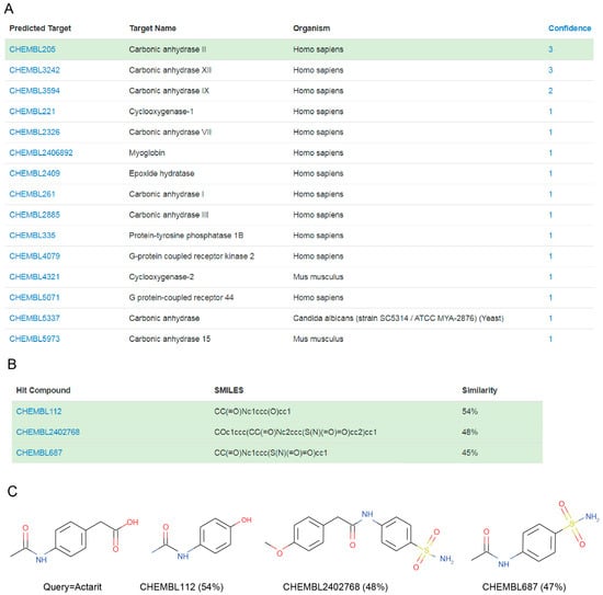 Figure 1. (A) MolTarPred v1′s predicted targets for actarit. There are 15 predicted targets, one per row, sorted by decreasing reliability (confidence) score. Carbonic anhydrase II (CAII), highlighted in green, appears as a target of actarit with a reliability score of 3. (B) SMILES and similarity scores of the three top hits annotated with the inspected predicted target (CAII). (C) Chemical structures of the query molecule (actarit; left) and its three CAII-annotated top hits listed in (B) on the right.
