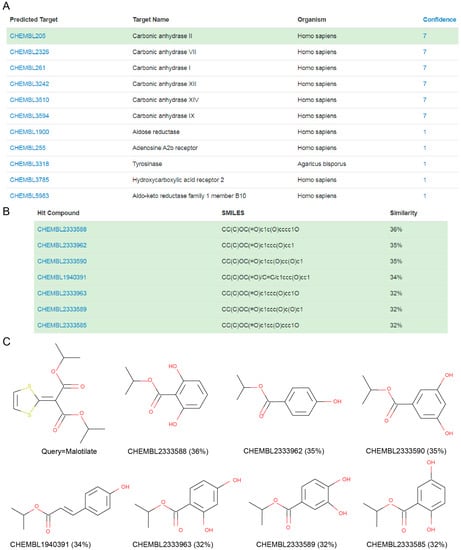 Figure 3. (A) MolTarPred v1′s predicted targets for malotilate. There are 11 predicted targets, one per row, sorted by decreasing reliability (confidence) score. CAII, highlighted in green, appears as a target of malotilate with a reliability score of 7. (B) SMILES and similarity scores of the seven top hits annotated with the inspected predicted target (CAII). (C) Chemical structures of the query molecule (malotilate; top left) and its seven CAII-annotated top hits listed in (B) to its right and bottom row.