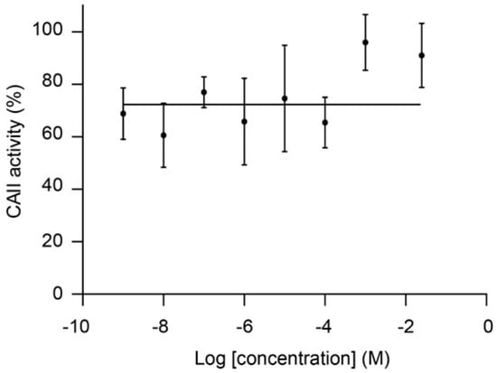 Figure 4. CAII inhibition by malotilate lacks a dose-response curve and thus data could not be well fitted by non-linear regression to calculate an IC50. Error bars represent the standard error of the mean of triplicate average values.