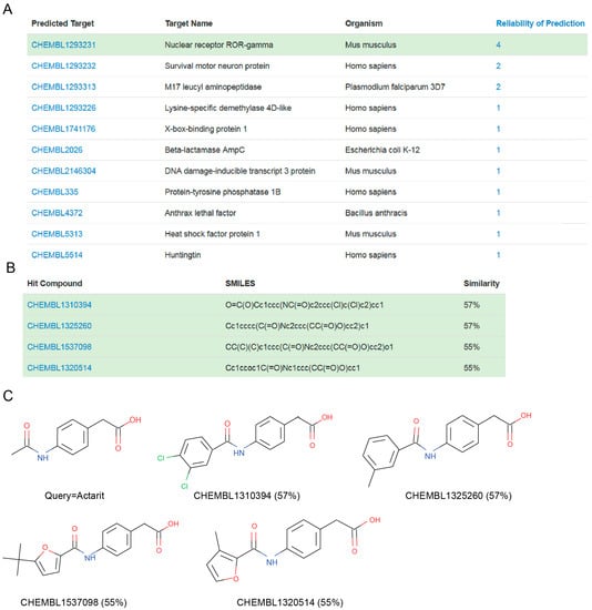 Figure 5. (A) MolTarPred v2′s predicted targets for actarit. There are 11 predicted targets, one per row, sorted by decreasing reliability score. ROR-γ, highlighted in green, appears as a target of actarit with a reliability score of 4. (B) SMILES and similarity scores of the four top hits annotated with the inspected predicted target (ROR-γ). (C) Chemical structures of the query molecule (actarit; top left) and its top four ROR-γ-annotated hits listed in (B) to its right and bottom row.