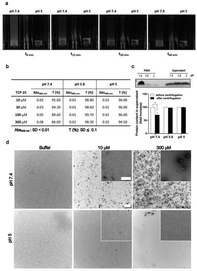 Next, to explore whether the aggregated TCP-25 could be redissolved, we resuspended the pellet from the pH 7.4 sample in 10 mM Tris at pH 7.4 or in 10 mM NaOAc at pH 5.8 or 5. The results showed the same repartition in the pellet and supernatant after centrifugation as with the freshly prepared TCP-25 (Figure S1a), which indicates the reversibility of the observed oligomerization/aggregation of TCP-25. TEM was employed to visualize the oligomers/aggregates, which revealed multiple TCP-25 aggregates in Tris-buffer at pH 7.4, particularly at 300 µM (Figure 1d). This contrasted with the findings in NaOAc buffer at pH 5.0, where fewer aggregates where observed.